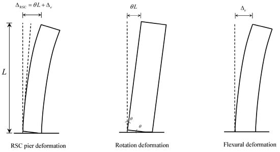 The unbonded ED bars in the joint section lead to uncoordinated strains between the concrete and ED bars, and uncoordinated strains on both sides of the neutral axis. Hence, the assumption of a plane section remaining plane in traditional reinforced concrete structural section analysis is not applicable, and conventional bending moment–curvature analysis cannot be used. Consequently, the top displacement of RSC bridge piers can be regarded as a combination of the rotational displacement caused by the rotation angle at the joint section and the flexural deformation of the piers, as illustrated in Figure 1.