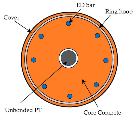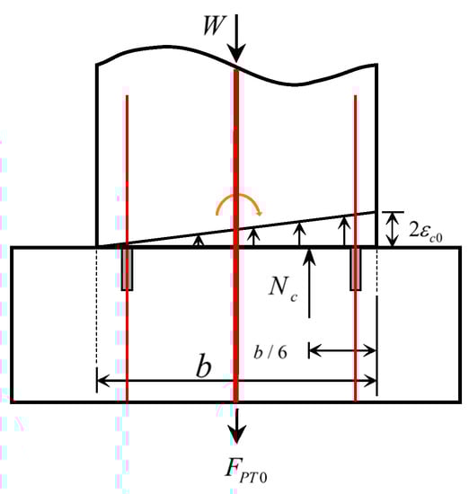 In the initial status before applying a lateral load, the bridge pier is subjected to the initial tension of the PTs and the weight of the upper structure, as shown in Figure 2. At this stage, the initial strain εc0 at the bottom section of the pier can be calculated as: