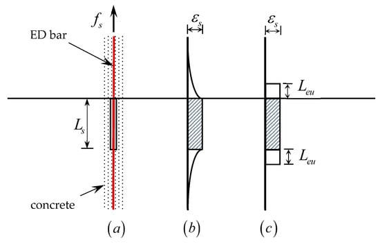 When calculating the tensile strain of the ED bar, the strain penetration effect should be considered. The ED bar is deeply embedded in the concrete, as depicted in Figure 5a. In the unbounded segment, the tensile stress of the ED bar is uniform. In the bonding segment, during the process of stress transfer, the strains of the steel and the concrete gradually change, the tensile stress of the steel decreases gradually from the outside to the inside along the length of the steel, the tension is gradually transferred to the concrete, and the bonding force of the concrete increases overall until the tensile stress of a certain point in the steel is zero, as shown in Figure 5b. Hence, the actual strain penetration length of the steel in the concrete can be equivalent to a length of unbounded segment, denoted as Leu [] in Figure 5c. When calculating Leu, it is important to note that εs changes with Leu and Leu should converge before the calculation.
