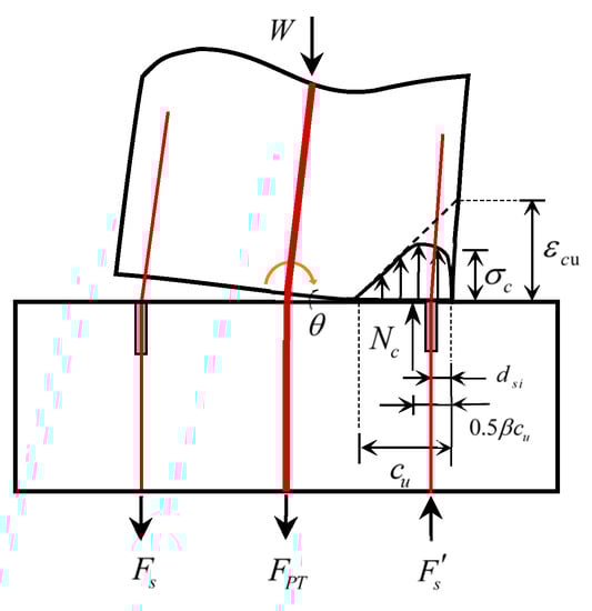 where Nc represents the force of concrete in the pressure zone, FPT represents the combined force of the tensile PTs, Fs represents the combined force of the tensile ED bars, and represents the combined force of the compression ED bars.