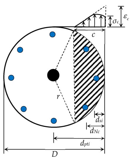 For confined concrete, the model proposed by Mander [] can be used. To simplify calculations, the complex stress distribution of the compressed concrete can be replaced by an equivalent rectangular stress distribution.