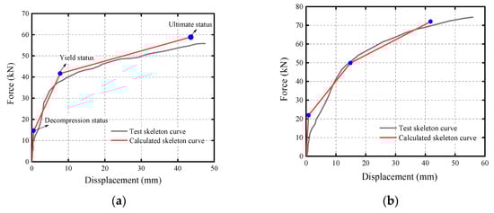 The above method involves determining and calculating three statuses, connected by straight lines, as shown in the comparison chart of skeleton curves, which displays a clear three-segmented line. The first inflection point signifies the decompression status, the second inflection point represents the yield status, and the final point denotes the ultimate status, as depicted in Figure 11. The results obtained from this calculation method exhibit good agreement with the skeleton curves and effectively reflect the behavior of the experimental skeleton curves.