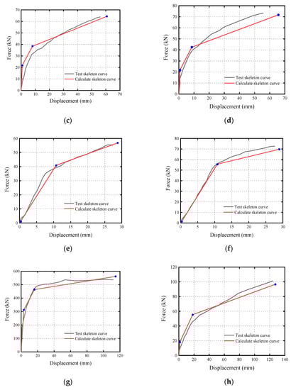 Comparison of the skeleton curves between calculated and test results. (a) Specimen HBD1, (b) specimen HBD2, (c) specimen HBD3, (d) specimen HBD4, (e) specimen G75W, (f) specimen G140W, (g) specimen TRB-B, (h) specimen FRP1.