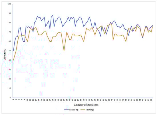 Initially, the basic requirement of prediction training, testing and validation accuracy was predicted using the combination of ANFIS and LSTM. Figure 4 represents the training and testing accuracy of 97 iterations and 100 nodes’ data. The implementation hyperparameters are presented in Table 5 and Table 6.