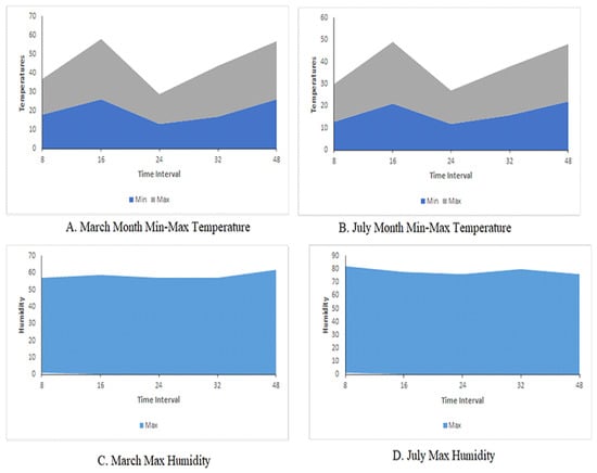 In this work, three types of requirements are predicted: short-term (8 h, 16 h), long-term (24 h, 48 h and 60 h) and changes implemented after transferring learning from one farm to another. The shortest inference result is predicted with the help of ANFIS, and long-term prediction is carried out with the help of LSTM. The shortest term prediction analysis was carried out in two months, March and July. The reason for the prediction of March and July is that rainfall is low during March. Similarly, in July, the rainfall starts, and, thus, the atmospheric temperature is low. The moisture and humidity of the current and the short-term requirement prediction of March and July’s requirement prediction, using ANFIS, are presented in Table 7. The shortest term prediction requirements are shown in Figure 5. The month-wise temperature and humidity are the two main requirements of short- and long-term predictions, such as temperature and humidity for 8, 16, 24, 32, and 48 h. The figure describes the minimum and maximum temperature and humidity, starting from 8 am and continuously measuring up to 48 h. Transfer learning is used for knowledge gained in the initial model in farm 1 and the knowledge gained by farmer 1 is used to retrain the farmer-2 models for better prediction using the changes from the farmer-1 data.