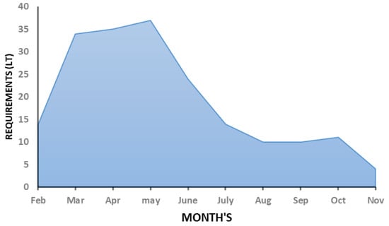 The minimum irrigation requirement is nine, and the maximum is 16. Similarly, requirements are very low in the next three months, but during the summer, the irrigation requirements are very high in April, May and the middle of July. The entire year-wise irrigation requirements of farm 1 are presented in Figure 6. In this Figure 6, minimum and maximum requirements are summarized for farm 1. The maximum requirements are higher in March, April and May.