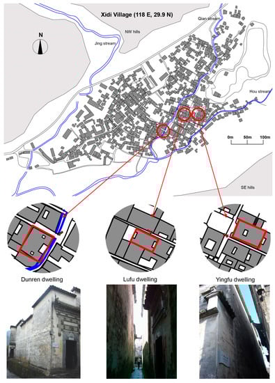 Of all the skywell houses in Xidi Village, about 80% were AO-shaped skywell houses, 11% were HUI-shaped skywell houses, and 9% were H-shaped skywell houses. One of each type was chosen for further investigation—Yingfu dwelling (HUI-shaped), Lufu dwelling (H-shaped), and Dunren dwelling (AO-shaped). The locations of these dwellings in Xidi Village are shown in Figure 2. The basic information of three monitored dwellings in Xidi Village is summarized in Table 4: Dunren dwelling (floor area 174 m2), Lufu dwelling (floor area 147 m2), and Yingfu dwelling (floor area 185 m2).