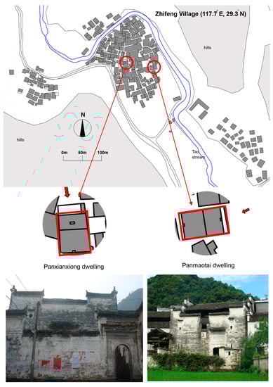 Two typical houses—Panmaotai dwelling (H-shaped) and Panxianxiong dwelling (H-shaped)—were chosen for further investigation. Basic information about these monitored dwellings is summarized in Table 5: Panxianxiong dwelling (floor area 198 m2) and Panmaotai dwelling (floor area 162 m2).