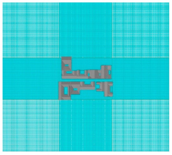 In the PHOENICS software, the quality of mesh generation largely affects the accuracy and stability of the simulation results []. To ensure the accuracy and computational efficiency of the simulation results, the mesh division must be reasonable []. According to the existing Japanese AIJ regulations, the stretching ratio of two adjacent grids must be under 1.3, and the minimum resolution of the grid is 1/10 of the building scale. In Jiangsu Province [] and the Beijing Green Building Design Standard [], it is stipulated that: the grid division at a 1.5 m or 2 m height in the pedestrian area next to the building should be 10 grids or more; the key observation area is placed at the third grid or more on the ground. Combining with the above regulations, this paper reasonably divided the calculation grid, taking Xidi Village as an example in Figure 6.