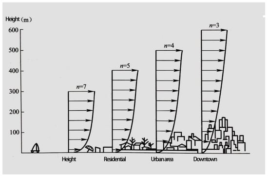where is the reference height (m), usually 10 m, is the average wind speed at the reference height (m/s); is the average wind speed at height Z (m/s). The index is the degree of wind speed reduction near the ground surface, and the increase in the index represents the increase in the degree of ground roughness. According to the classification of ground roughness and the corresponding index value given in the Code for Structural Loading of Buildings (GB50009-2012 []), as shown in Table 9, the value of 0.3 was taken in this paper according to the actual situation.
