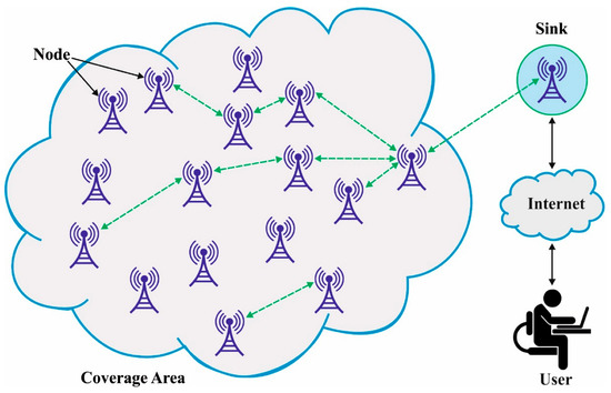 The Internet of Things (IoT) has been recently made practical with the enforcement of certain existing technologies, such as intelligent sensing and wireless sensor networks (WSN) [1,2]. The applications of the IoT comprise agriculture [3], healthcare [4], security [5], transportation, inventory tracking, and smart grid networks [6]. The interconnected smart objects with embedded sensors in the IoT platform coordinate and cooperate to transfer the gathered data to a gateway sink. For IoT-related applications, such as smart homes, as well as logistics management, industrial control, and environmental sensing, the WSN becomes an indispensable part of the architecture [7]. The WSN is denoted as a graph of many interconnected sensor nodes (SNs) in which all the nodes sense pieces of information from the network and transfer them to an ultimate station [8]. The architecture of IoT-related WSN is autonomously planned without any complicated time-taking installation and configuration other than the common wired networks for various purposes. Figure 1 exemplifies the infrastructure of WSN.