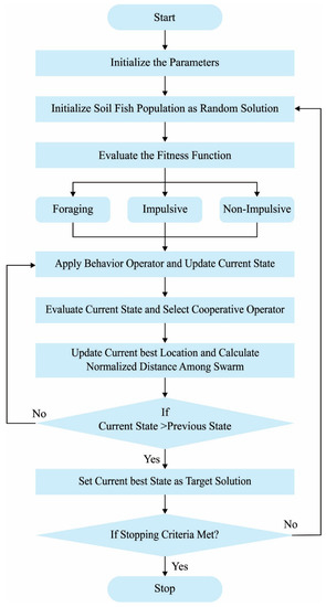 The algorithm begins with population initialization. Then, the fitness function is determined with foraging—impulsive and non-impulsive. Next, the current state of the soil fish can be evaluated and the optimal one is chosen as the target solution. The process gets repeated until the stopping criteria are satisfied. The foraging operators are closely connected to all the fish’s weight updating model. It can be defined by the success rate accomplished in the present iteration. The rise in fish weight maximizes the probability of acquiring an optimal region. Moreover, the weight function can be expressed by: