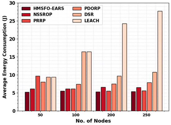 Table 3 and Figure 3 report a comparative average energy consumption (AECN) analysis of the HMSFO-EARS model with recent models. The outcomes specified that the LEACH model has shown poor performance with higher AECN values. Then, the PDORP and DSR models have indicated moderately closer and reduced AECN values.