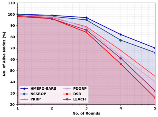 A comparative number of alive nodes (NAN) study of the HMSFO-EARS model is portrayed in Table 4 and Figure 4. The results inferred the betterment of the HMSFO-EARS model with increasing values of NAN. For instance, in Round 1, the HMSFO-EARS model has revealed a higher NAN of 99% whereas the NSSROP, PRRP, PDORP, DSR, and LEACH methods have portrayed a lower NAN of 98%, 97%, 98%, 96%, and 96%, respectively. In addition, in Round 5, the HMSFO-EARS method has portrayed a higher NAN of 70% while the NSSROP, PRRP, PDORP, DSR, and LEACH models have shown the lowest NAN of 66%, 45%, 40%, 26%, and 32%, correspondingly.