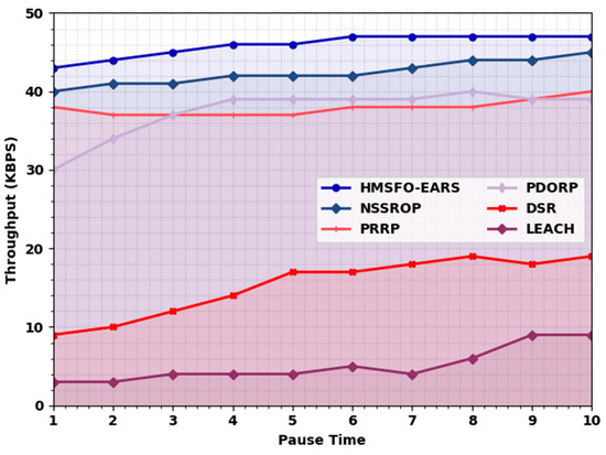 Throughput analysis of HMSFO-EARS system with existing approaches under different pause times.
