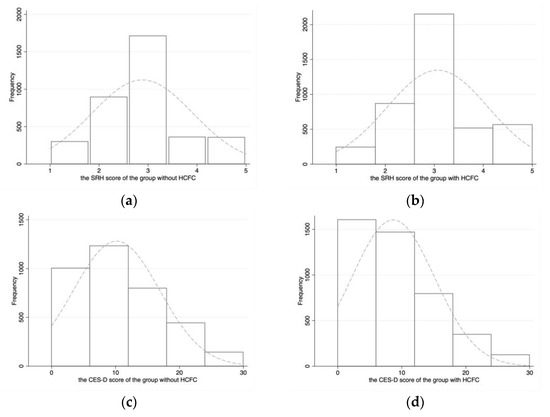 (a) Distribution of SRH score in the group without HCFC; (b) Distribution of SRH score in the group with HCFC; (c) Distribution of CES-D score in the group without HCFC; (d) Distribution of CES-D score in the group with HCFC.