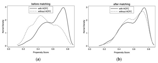 (a) Kernel density distribution before matching; (b) Kernel density distribution after matching.