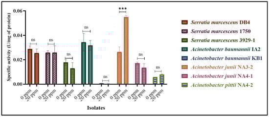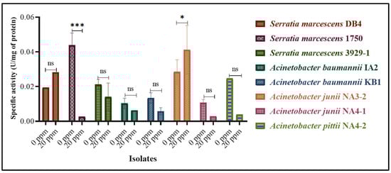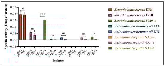 Specific activity of 8 chlorine-resistant isolates measured by an antioxidant enzyme (catalase) assay (In Figure 2, symbols represent statistical significance, *** p < 0.001, and “ns” stands for no significance between the control (0 ppm) and test (20 ppm) samples of each isolate).