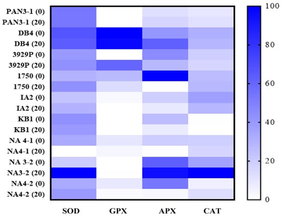 To overcome H2O2-related cell damage, bacteria possess various antioxidant mechanisms. Figure 5 presents a data matrix that shows the numeric differences in the form of a heat map. A sequential color scheme has been provided with the highest value in dark blue and the lowest values in white. The heat map provides a notable difference in the antioxidant activities checked as well as between the bacterial strains exposed to 0 ppm and 20 ppm chlorine. Isolate Acinetobacter junii NA3-2 (20 ppm) showed the highest SOD activity and showed similar activities when exposed to chlorine stress (comparing 0 ppm and 20 ppm). To counteract the higher SOD, the catalase activity of isolate NA3-2 was also high. In the case of catalase activity, the strains DB4, 3929, 1750, and NA4-1 exposed to 20 ppm chlorine showed similar activities as their unexposed strains. The result is further supported by statistical analysis where SOD and catalase had a positive correlation (R2 0.609, data not included). APX and GPX enzymes are known to increase under various stress conditions [20]. Our results presented a large degree of difference between the results of these two activities. In the case of GPX, most of the isolates showed little or no activity. The decreased GPX activity could be attributed to defects in antioxidant enzymes [20]. However, isolates DB4, 3929, and 1750 (all Serratia marcescens) were the only isolates that showed higher GPX activity.