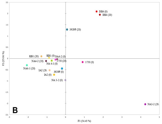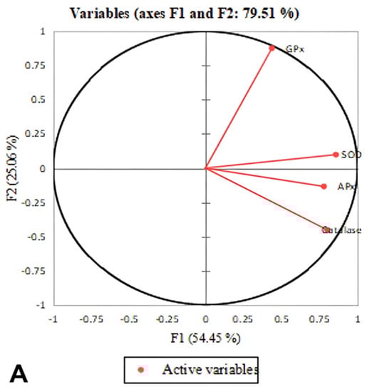 The PCA results focused on the observation tables and the correlation tables obtained during analysis. In Figure 6A, the red vectors represent the investigated variables. SOD, APX, and catalase were positively linked variables, which can be inferred from the angles between the vectors. Additionally, catalase and GPX were unrelated variables presented in right angled vectors. Figure 6B shows a scatterplot having axes that correspond to two different principal components. F1 (54.45%) and F2 (25.05%) were the first two components showing the largest variance. This chart (Figure 6B) relates the isolates to variables and to one another. As observed in the scatterplot, there were no strain-dependent similarities in the results obtained (No distinct pattern was seen in the Acinetobacter or Serratia species), although isolate DB4 was detected to be an outlier. However, there were similarities in the antioxidant activities of the isolates obtained for different exposure conditions.
