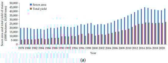 As can be seen from Figure 1a, the sown area of maize is basically maintained at around 20 million hectares before 1995. By 1999, the area had increased to 25 million hectares, and then began to decrease. Since 2003, there has been an increasing trend year by year, which reached a peak in 2015. In the following years, affected by the structural reform policies of the national planting industry, the area has decreased, but it shows a growth trend in 2021. The total yield of maize was less than 100 million tons before 1995, and it exceeded 200 million tons in 2011. Although the sown area in 2021 was not the largest, its total yield was the highest. The average yield was 6.3 tons/hectares, which was 2.3 times the average yield in 1978.