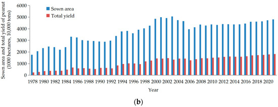 It can be seen from Figure 1b that the peanut sown area is in a fluctuating state. In 1998, the area exceeded four million hectares and showed a trend of annual growth, reaching a peak in 2003. In the following years, it decreased somewhat, but remained basically within the range of four to five million hectares. Before 1995, the yield of peanut showed an overall growth trend, but both were less than 10 million tons. It exceeded 15 million tons in 2010 and 18 million tons in 2021. The average yield in 2021 was 3.8 tons/hectares, which was 2.8 times the average yield in 1978.