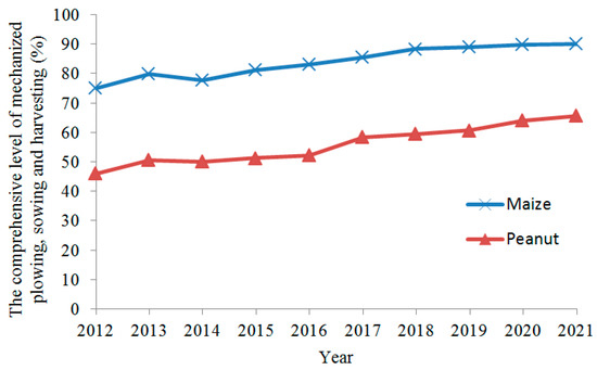 Mechanized operation is the foundation for achieving high quality and efficient production of maize and peanut, which can significantly increase productivity and reduce labor intensity [21,22]. In recent years, with the progress of science and technology and social development, the mechanization rate of maize and peanut production in China has significantly improved. In 2021, the comprehensive rate of mechanized plowing, sowing and harvesting of maize in China has reached 90%, which was 38 percentage points higher than that in 2008. Among them, the mechanization rate of plowing exceeded 98% and the mechanization rate of sowing exceeded 90%. Additionally, the mechanization rate of harvesting approaches 80%. The comprehensive rate of the mechanized production of peanut exceeded 65%, which was nearly 30 percentage points higher than in 2008. Among them, the mechanization rate of plowing exceeded 80%, and the mechanization rate of sowing and harvesting were around 60% and 50%, respectively. Figure 2 shows the comprehensive rate of mechanized production of maize and peanut in China in the past 10 years.