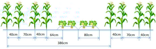 As shown in Figure 5, the total width of the 4-4 strip intercropping is 386 cm. Four rows of maize are used as a planting belt with a row spacing of 40 cm on both sides and a row spacing of 70 cm in the middle. This wide and narrow row configuration is conducive to the ventilation of the middle two rows of maize. Two rows of peanuts form a planting belt. The ridge height of peanuts is 15 cm. The ridge spacing is 80 cm, and the row spacing on the ridge is 28 cm, which is basically consistent with the peanut monoculture parameters. At this time, the width of the planting belts for the two crops is similar, which is conducive to the inter-annual rotation of maize and peanut, and can eliminate the obstacles to continuous peanut cultivation [37,38].