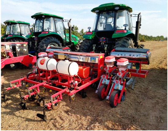 According to the needs of mechanized sowing, field spraying, and harvesting under the condition of 4-4 strip intercropping, the basic matching principle is to fully consider the current actual agricultural production conditions and the status of operating machinery [39]. In addition, it is preferred to appropriately modify existing machinery to adapt to the requirements of row spacing and plant spacing for strip intercropping, and improve the utilization rate of existing machinery.