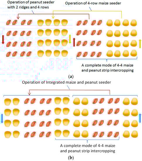 Schematic diagram of 4-4 strip intercropping: (a) Separate operation of maize seeder and peanut seeder; Note: the orange arrow indicates the forward direction of the maize seeder, and the red indicates the forward direction of the peanut seeder. (b) Operation of integrated maize and peanut seeder. Note: the blue arrow indicates the forward direction of the maize and peanut integrated seeder.