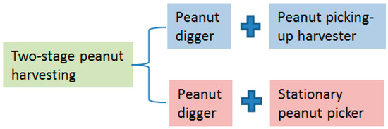 There are two methods of peanut harvesting: two-stage harvesting and combined harvesting. Two-stage harvesting begins with the use of a peanut digger to complete digging and soil cleaning. The peanut plants were dried in the field for 3 to 5 days to reduce the moisture content of the pods to less than 20%. Then, using the peanut picking-up harvester to complete the pick-up, pod picking, cleaning, and collecting. It is also possible to manually collect dried peanut plants and complete peanut picking, cleaning, and collecting through a stationary peanut picker. The main methods and processes of two-stage peanut harvesting are shown in Figure 9. The recommended machinery is shown in Figure 10.