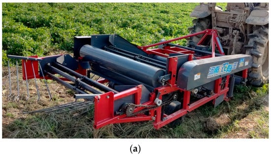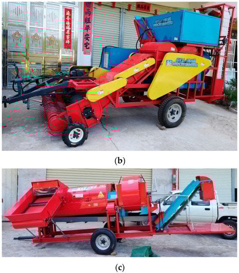 Figure 10a shows a typical peanut digger suitable for peanut harvesting in the Henan Province of China. It is suspended by a tractor and has a working width from 1400 to 1700 mm. It can complete the digging, soil cleaning, and laying of two ridges of peanuts simultaneously. Figure 10b shows a typical peanut picking-up harvester suitable for this area. This type of machine is tractor driven with a working width of about 1600 mm. It can complete the operations of pick-up, pod picking, cleaning, and collecting four rows of peanuts simultaneously. Figure 10c shows a typical stationary peanut pod picker suitable for this area. This type of machine is equipped with a working power of over 15 kW, and can complete peanut picking, cleaning, and collecting simultaneously. Its operating efficiency is ≥1500 kg/h. It can be moved to the work site by tractor traction according to work needs.