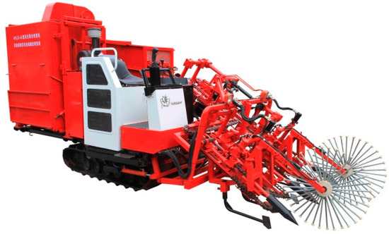 The local conventional four-row maize harvester can meet the requirements of strip intercropping maize harvesting. The matching power of this type of machine is about 132.3 kW (180 horsepower). It can complete the combined harvesting of maize in four rows with a row spacing from 45 to 75 cm simultaneously (Figure 8).