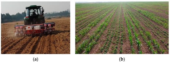 The total area of the experimental field is about 10 hm2, and the soil type is sandy loam soil. The sowing time for 4-4 strip intercropping was 14 April 2022. The machinery used was a maize and peanut integrated seeder jointly developed by the Nanjing Institute of Agricultural Mechanization, Ministry of Agriculture and Rural Affairs, Nanjing, China and Henan Nongyuwang Agricultural Equipment Technology Co., Ltd., Zhumadian, China. The maize variety was Zhengdan 958. This maize variety has a compact plant type and is suitable for intercropping. The peanut variety was Yuanza 9307. This peanut variety is more shade tolerant and suitable for mechanized harvesting. The field sowing experiments and crop growth are shown in Figure 12.