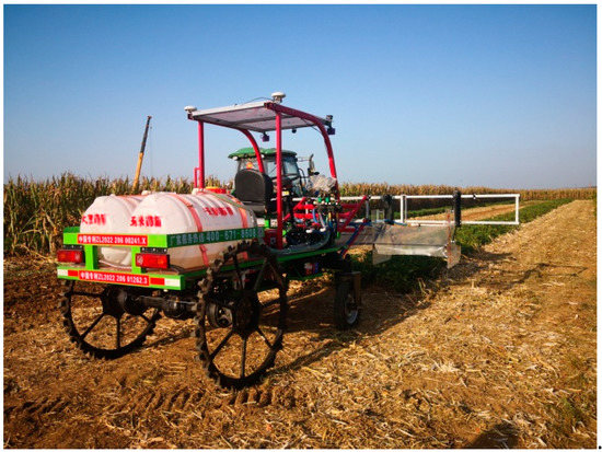 In the field spraying of maize and peanut, the self-propelled maize and peanut/soybean strip intercropping boom sprayer jointly developed by the Nanjing Institute of Agricultural Mechanization, Ministry of Agriculture and Rural Affairs and Yucheng City Yatai Machinery Manufacturing Co., Ltd. was used. As shown in Figure 13, this machine is equipped with an isolation device and a modified dual spraying system. It can meet the requirements for spraying herbicides, insecticides, and growth regulators in maize-peanut strip intercropping by adjusting the positions of the spray heads and baffles.