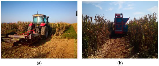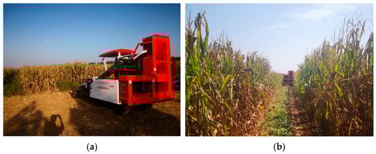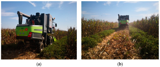 The TB90G self-propelled grain combine harvester produced by Zoomlion Heavy Industry Science & Technology Co., Ltd. (Shanghai, China) was used for maize harvesting. The matching power of this machine was 140 kW, which can meet the requirements of four-row maize combined harvesting under the 4-4 strip intercropping. The field harvest test is shown in Figure 16.