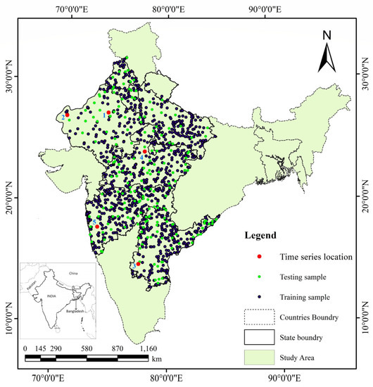 The study area for this research covers the area of India and Bangladesh. For the last two decades, the area has been severely affected by groundwater depletion. India, severely affected by groundwater depletion, covers an area of 2.28% (297 million ha) of the global land area and has a population of 1.24 billion, which is 17.80% of the global population. The total groundwater withdrawal in India (245 billion m3 in 2011 [25]) puts India on the top of the list for groundwater consumption globally [26]. India contains 22 major river basins [27]. In the northwest part of India, the Rajasthan, Uttaranchal, and Haryana states are facing high groundwater depletion due to high agricultural consumption of groundwater for irrigation purposes. The location map and spatial distribution of training and testing data in groundwater are shown in Figure 1.