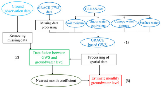 Methodological workflow for a research study. (1) monthly GWS changes are identified using GRACE and GLDAS datasets; (2) spatial regression models between the monthly GWS changes and groundwater levels are generated; (3) monthly groundwater levels are estimated based on GRACE data from nearest-month coefficients.