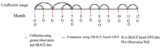 Monthly estimation of groundwater level using GRACE-based GWS and calibrated coefficients from neighboring observed months.