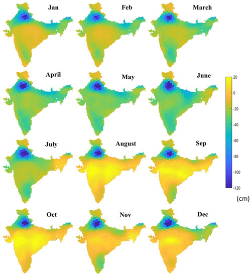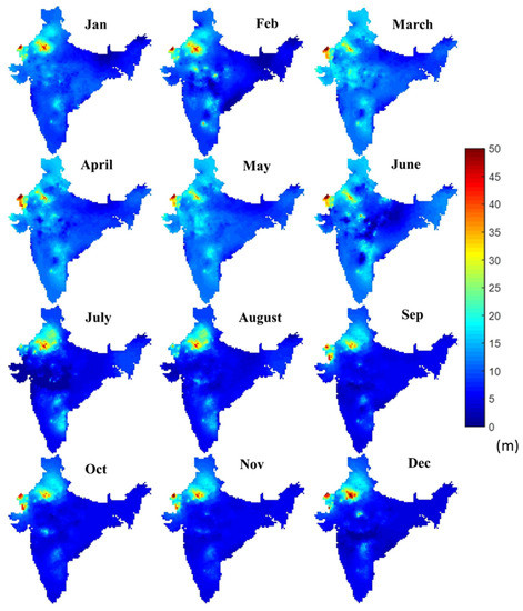 Figure 5 shows the monthly estimation maps of groundwater in 2019. The spatial and temporal variations in groundwater level can be identified using Equations (3)–(5). The results indicate that the northern area of India has a higher depth of groundwater level compared to the southern part. In the northern area, the depth of the groundwater level can reach from 50 to 55 m below the earth’s surface, while in the southern part, the level is only 15 to 20 m below the ground. Chen et al. [4] conducted a study on long-term groundwater variations in India and found that northwest India has a decreasing trend in groundwater storage, which further leads to groundwater level depletion in the area and also the surrounding areas of northern India. As the consumption of groundwater is high in the first months, the lowest groundwater level can be identified at around 55 m below the ground, and in the months of the monsoon season, the groundwater level starts to recover from September onwards. After the monsoon season, consumption of groundwater reduces. The depth of the groundwater level in the winter season rises, and the groundwater level extends to a range of between 40 to 45 m below the ground during the months of the winter season. The consumption of groundwater increases at the start of the year, and the groundwater level decreases due to high groundwater extraction. In Figure 5, results show that the groundwater level is very low in northern India, which further adds to depletion problems in terms of water resources. This approach not only shows the hotspots of the groundwater depletion, but also the spatio-temporal pattern variations in groundwater changes. The seasonal variations from climate and groundwater exploitation affect groundwater changes.