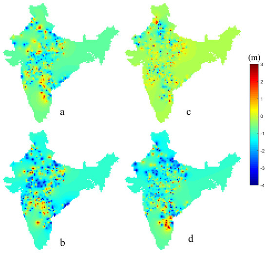 For the validation of groundwater level estimation, the RMSE (root mean square error) was calculated from the field observation and the estimation of the model in Table 1. The estimated values were extracted by the locations of observation wells in January, May, August, and November, during 2019. The average RMSE for groundwater level is 2.37 m. Figure 6 shows the groundwater level residual maps in (a) January, (b) May, (c) August, and (d) November, during 2019. Spatial residuals are randomly distributed. This represents the good performance of the estimation, since spatial regression usually reduces the spatial autocorrelation of model residuals. Furthermore, our future work will consider machine learning or deep learning approaches as data fusion models to reduce overall model residuals.