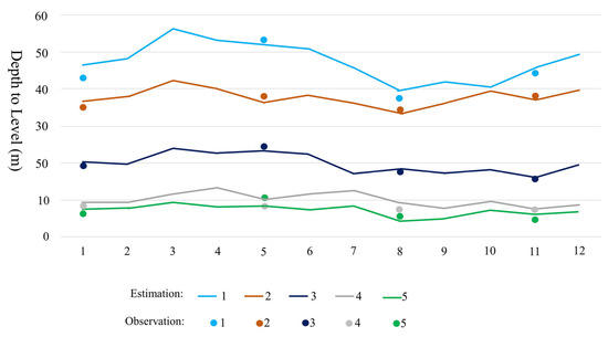 Monthly estimated and seasonal observed groundwater level depth in 2019 at five stations (red points in Figure 1, longitude and latitude are shown in Appendix A).