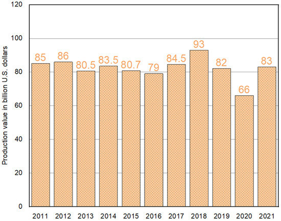In this modern era, machine tools have replaced handwork and greatly improved efficiency and productivity during the industrial revolution. However, several types of machine tools have been developed from time to time. The machine tools market strengthened its position globally with the increment in its demand in industrial organizations for the sake of automation and improvement of production processes, resulting in its transformation and becoming among the most substantial submarkets in industrial production; for example, during the last decade, the demand for machine tools around the globe has increased more than double, reaching roughly USD 181 billion in 2019. Machine tools’ global production from 2011–2021 is depicted in Figure 2. It is very clear from the figure that there is a fluctuating trend in yearly machine tool production. The year 2018 experienced around USD 93 billion, and the year 2021 amounted to USD 83.9 billion towards the world’s machine tool production value, which represents a 24% increase compared with the past year when the shock of negative demand across the globe was caused by the COVID pandemic. Amada, Trumpf, DMTG, and Shenyang were the largest producers of machine tools in the same year.