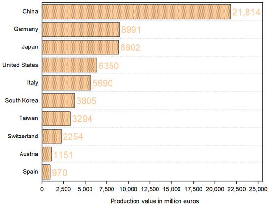 Several countries specialize in manufacturing intelligent machine tools even though they have a high demand for their industrial production, including China, Germany, Japan, the United States, Italy, South Korea, Taiwan, Switzerland, Austria, and Spain. Based on the production value, the list of leading countries in machine tool production in 2021 is given in Figure 3. China appeared as a leading producer of machine tools around the globe in 2021, with an exceptional manufacturing record of EUR 21.8 billion. Germany, compared to China, amounted to EUR 9 billion less in production volume and became the world’s second-largest machine tool manufacturer. Japan was in a close race with Germany in production value and amounted to around EUR 8.9 billion; the US was in fourth place and amounted to EUR 6.35 billion worth of machine tool production. South Korea, Taiwan, Switzerland, Austria, and Spain lagged far behind in manufacturing.