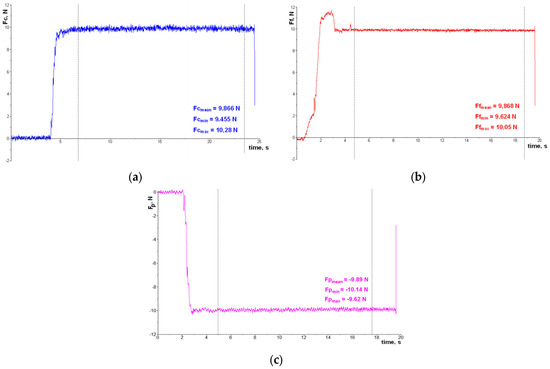 During short-term load, an average 9.866 N Fc force value is measured; on the other hand, Ff and Fp were measured at 9.868 N and −9.89 N, respectively. It is evident from the results, shown in Figure 6, that the measured forces value differs relatively little from the theoretical value.
