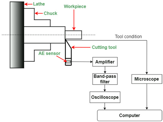 The TCM approaches acoustic emission (AE) as an input signal, and artificial intelligence methods mainly include ANN applications, fuzzy logic methods, and support vector machines (SVM). An application of acoustic emission in turning operation is depicted in Figure 7. For the sake of monitoring the capability of the AE sensor, the sensor is mounted on the cutting tool via a tool monitoring system, which keeps the sensor near the cutting area. This configuration brings the advantages of possible higher sensitivity and also the natural elimination of noise factors because of its closeness.