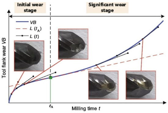 The time curve of flank wear depicting the initial healthy tool wear stage and the unhealthy tool stage.
