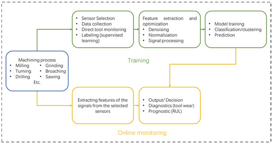 Figure 8 depicts a typical flank wear time curve involving the initial stage of tool wear and the unhealthy tool stage. Ta represents the time of the curve change, i.e., from concave to convex. The tool lifetime is divided into various health stages and health indicator HI after extraction of the time curve of flank wear cutting, which is considered the tool degradation trend [47]. The cutting tool life criterion had been predicted by applying three AE sensors clamped to the workpiece and the feed-forward back-propagation neural network (BPNN) in [48]. It was observed that AE sensors’ RMS and arithmetic average values, in combination with BPNN, could be successfully applied for tool-state reliable estimation. Ren et al. in [49] compared first and second-order interval type −2 FL (fuzzy logic) and the efficiency of higher-order FL systems considering acoustic emissions signals. Based on experimental results, it was concluded that higher-order FL systems were more advantageous over lower-order FL systems, i.e., first- and second-order FL systems. The estimation of AE uncertainty in combination with the IT2 FL system could be pretty helpful in decision-making while investigating cutting tool wear conditions. Zhang conducted a series of TCM tests during milling operation applying AE signals and sound signals in [50] considering support vector machine (SVM). SVRs optimization was conducted via multiple populations of the genetic algorithm (GA). Based on conducted experiments, it was identified that the proposed method was perhaps successfully applied for effective tool wear estimation level and tool condition classification. Higher accuracy can be achieved with the simultaneous application of both sensors. The experimental data obtained from the force sensor by observing the wear progression of the tool flank were used for the sake of training the convolutional neural network (CNN) in [51], as the cutting forces could be related to cutting tool flank wear via a network. The CNN network can be used for predicting tool wear. While conducting the milling experiments on stainless steel, the extreme learning machines (ELM) method was adopted to speed up the learning process and improve accuracy. In [52], Laddada evaluated cutting tool health conditions. Based on complex continuous wavelet transforms (CCWT) and an improved extreme learning machine (ILEM), he also estimated the remaining useful life (RUL). Firstly, the gathered AE signals were decomposed by means of CCWT, and the features were then fed to the learning algorithms in IELM to establish a suitable data-driven prognostic model describing cutting tool deterioration behavior for its current health condition evaluation and RUL prediction. Various cutting tests were conducted via a CNC milling machine to gather data for tool wear evolution model training. There are also models that have been developed based on unsupervised learning. Kumar [53] adopted an unsupervised learning approach for unlabeled data clustering; tool wear propagated gradually during cutting operation until its failure occurred. The HMM approach was adopted for the sake of performing modal-based clustering. It was considered that at the beginning of the cutting process, the tool was healthy and slowly, and gradually it proceeded to its failure. By using the polynomial regression model, a prognostic model was developed based on the diagnostic results. Table 1 presents some commonly utilized tool condition monitoring (TCM) methods and their contributions to intelligent machining. Jang [54] developed a novel device for estimating tool wear faster and more accurately through infrared (IR)-based image measurement equipment mounted on the machine tool and deep learning. For tool wear estimation, a predictive model was proposed using a multi-view convolutional neural network (CNN) based on reflected IR images using the multi-view CNN algorithm; it was concluded that machining efficiency can be improved by reducing tool wear measurement downtime and increasing utilization of tool life. Cheng [55] proposed a novel framework for prediction and monitoring tool wear based on attention mechanisms, normalization, and deep learning algorithms. The feature vectors were extracted from the obtained raw cutting signals and transformed into uniform ranges for improving tool wear monitoring. Multiple feature patterns were learned by means of a developed parallel CNN structure with different layers for tool condition monitoring. The short- and long-term tool wear predictions were obtained via a designed dense residual neural network (ResNetD). Based on the experimental results, it was found that the prediction accuracy was improved, and the training time was significantly reduced. Huang [56] proposed an indirect multi-information fusion-based tool wear measurement method by employing machine learning technologies in order to increase multi-sensor signal utilization efficiency and improve tool wear measurement accuracy. Huang [57] investigated the effect of the cutting path on the vibration signals and the acoustic emission (AE) during micro-milling operation. It was concluded that the time domain signals generated from straight line cutting, square path cornering, and circular pathing are all different, and the effect of cutting path on AE is lower than vibration signals. Figure 9 depicts a block diagram of the online TCM system, explaining how the data are extracted from the signals obtained from the machine tools by means of sensors, processed, and fed to the data-driven prognostic model to train for the sake of monitoring tool condition and useful life prediction. Figure 9 depicts a block diagram of the online TCM system, explaining how the data are extracted from the signals obtained from the machine tools by means of sensors, processed, and fed to the data-driven prognostic model to train for the sake of monitoring tool condition and useful life prediction.