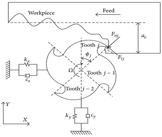 Figure 10 depicts a dynamic model describing the milling processes. The chatter analysis was made using this model along with the structure dynamics frequency response function and force modal mechanistic coefficients with teeth number, cut radial depth, and diameter, where Φj is representing the jth tooth position, Ω is representing spindle speed in (r/min), ae is representing the depth of radial cutting, and Fnj and Ftj are representing the normal and tangential cutting force components for the jth tooth, respectively. The governing equation for the above-mentioned dynamic milling system in Figure 10 can be given as [60],