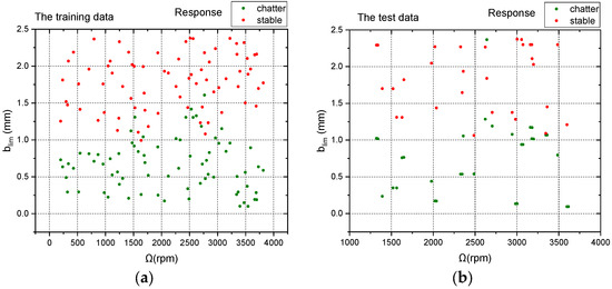 In the above-mentioned equation, , , and represent modal mass, damping matrix, and stiffness matrix, respectively; is cutter modal vector, and is time delay, i.e., = 60 (NΩ), where N is representing cutting, is denoting cutting coefficient matrix, which varies periodically concerning time, i.e., = . Xiaoli et al. [61] formulated a dynamic micromilling model and closed loop model system using two piezoelectric actuators (PZTAs) and an adaptive controller (using Lyapunov–Krasovskii functionals and NN control technique) for suppressing 2-DOF regenerative micro milling chatter. PZTAs were applied as active control elements for providing chatter suppression, a force compensation, and the uncertainties of cutting dynamics were approximated via neural networks. The simulation results showed that unstable cutting tool vibrations could be restrained in less than 4 ms using a designed controller and regenerative chatter could refrain before it starts deteriorating. Davim et al. [62] developed an ANN model for the prediction of surface roughness during turning operation, considering feed rate, cutting speed, and cut depth, and it was concluded that feed rate and cutting speed play a significant role in improving product surface finishing. It was also revealed that the artificial neural network base model proved quite tending in surface roughness prediction with absolute accuracy. The data set for ANN training and testing were acquired using a stability algorithm [63], shown in Figure 10. Data sets were generated considering random values for pairs (Ω, blim) ranging from 1000 rpm to 4000 rpm and 0mm to 2.5 mm. Cut was labeled unstable (chatter) or stable for values set by using the stability limit, and 201 points were generated in total, which can be seen in Figure 11. In order to train the ANN model, data were rescaled via the min–max method.